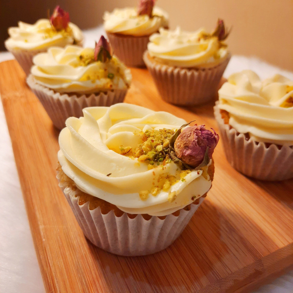 كب كيك فستق مغطاة بكريمة الجبنة اللذيذة
